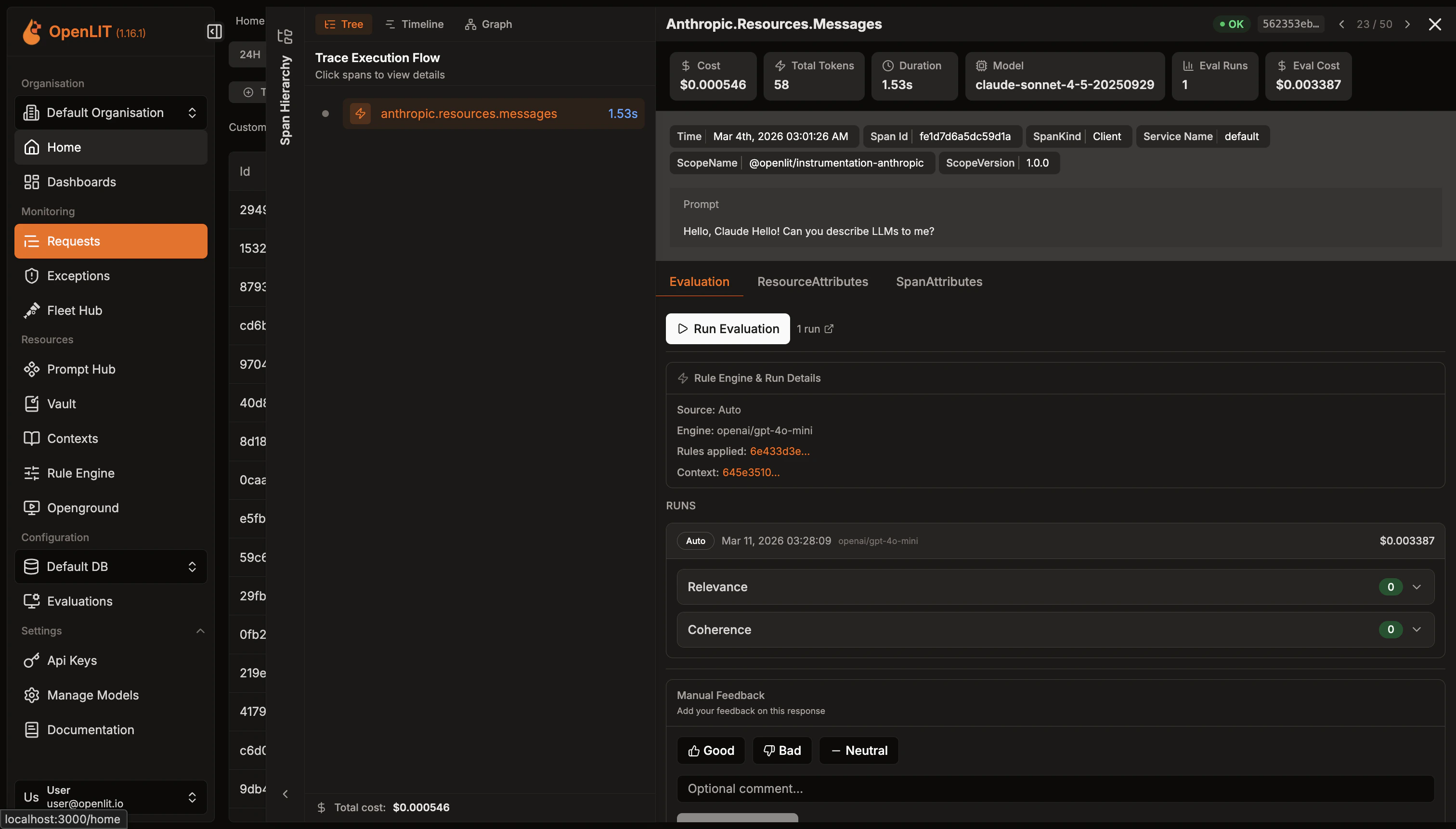 Once evaluations are running, OpenLIT continuously analyzes your LLM responses and provides actionable insights:- Review Individual Results: Examine detailed evaluation scores, classifications, and explanations for each LLM trace