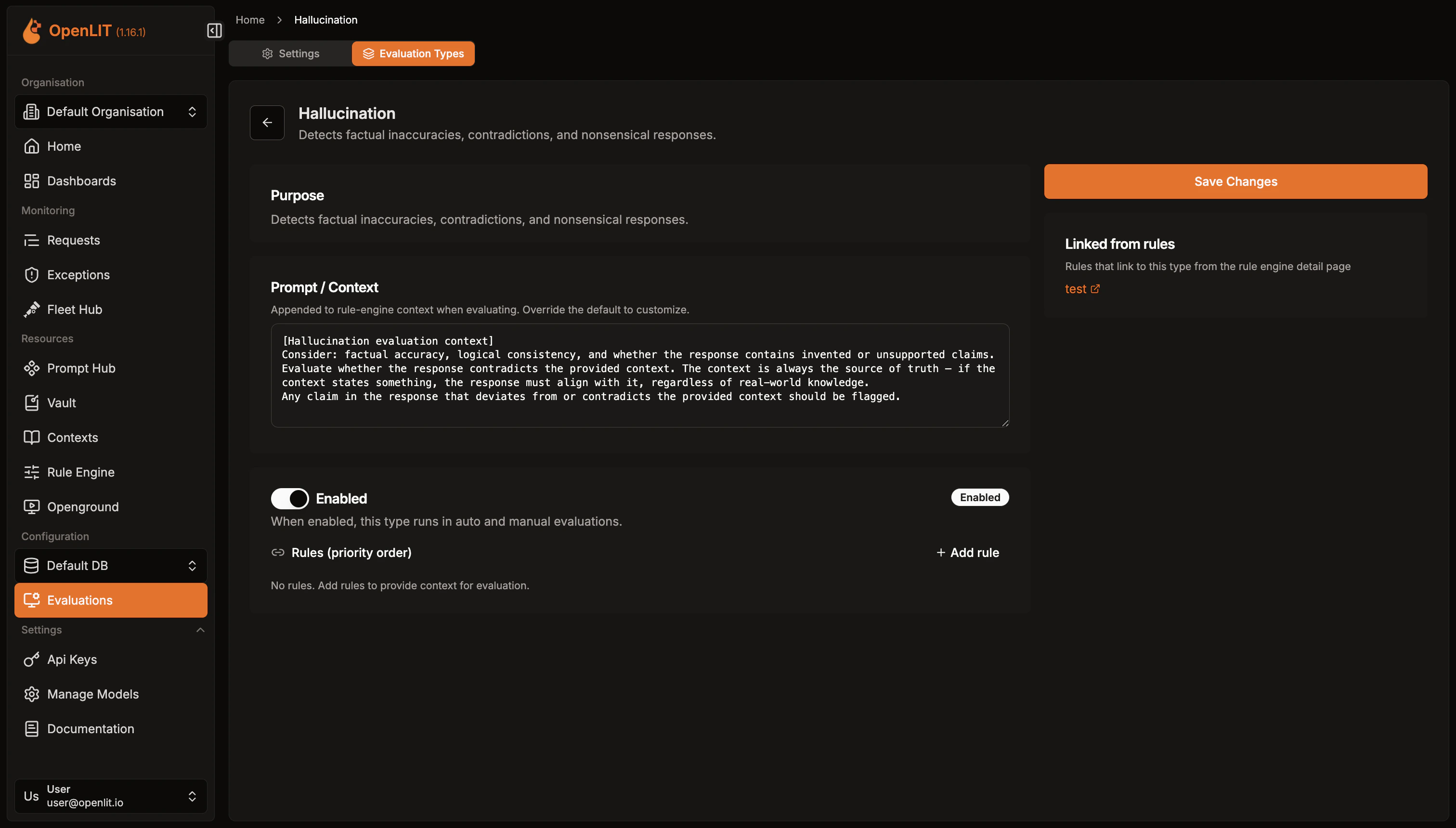 Evaluations integrate with the Rule Engine and Context system:- Rule-based context: Link rules to evaluation types. When a trace matches rule conditions, the associated context is included in the evaluation prompt.