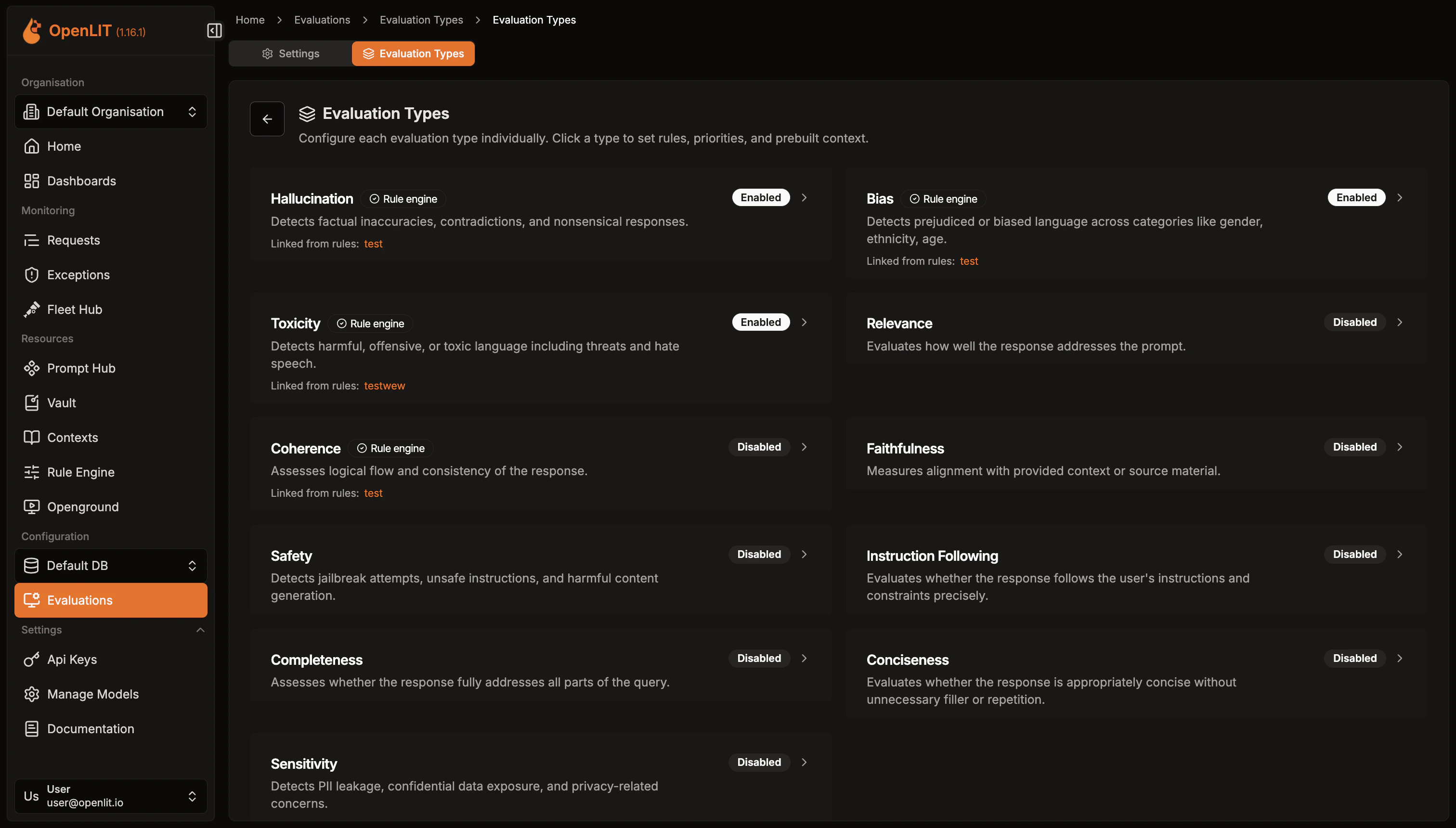OpenLIT provides 11 evaluation types that can be used to evaluate the output of your LLM calls. Each type can be independently enabled, customized with custom prompts, and linked to Rule Engine rules for conditional evaluation.Core evaluators (enabled by default)