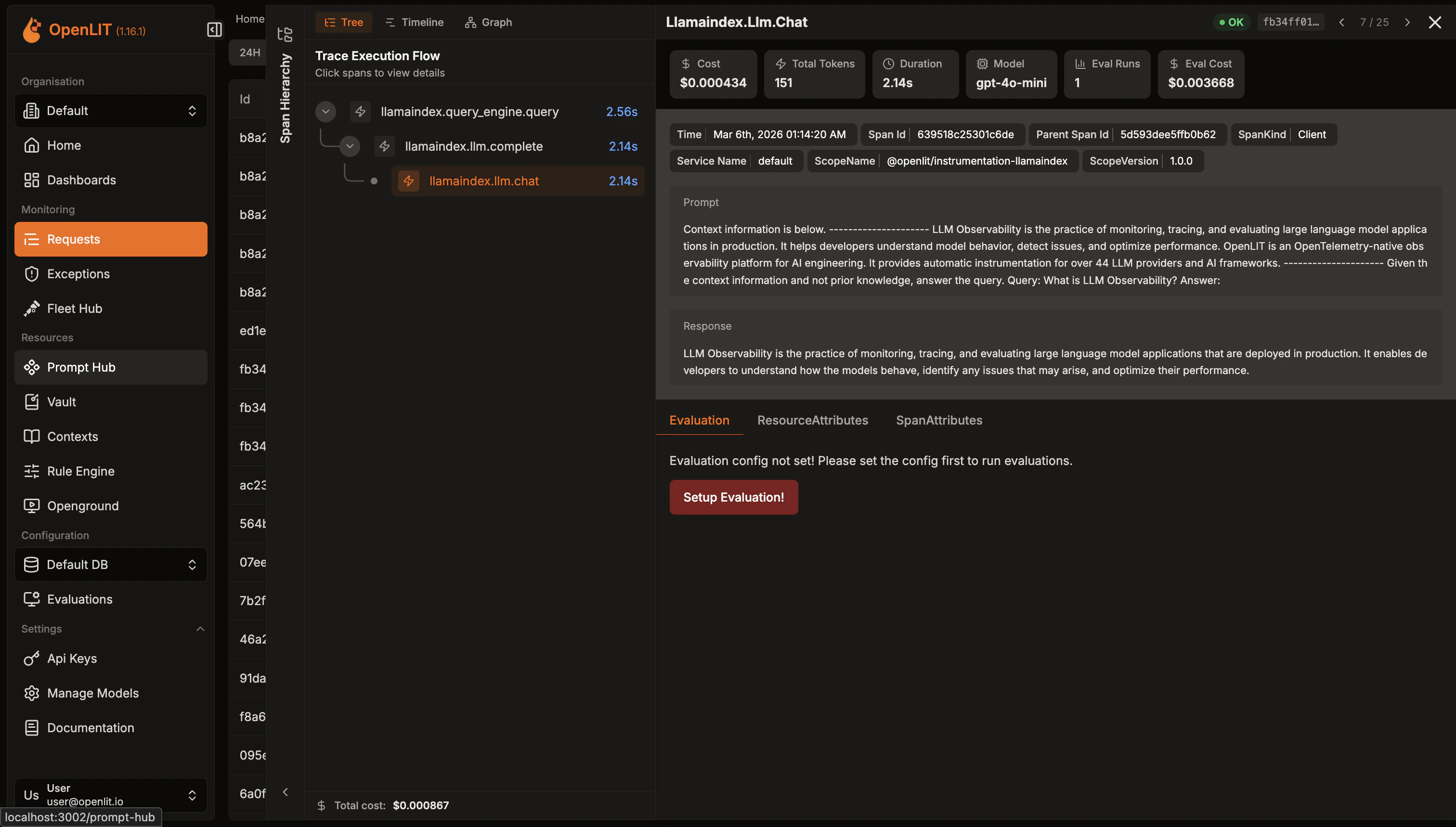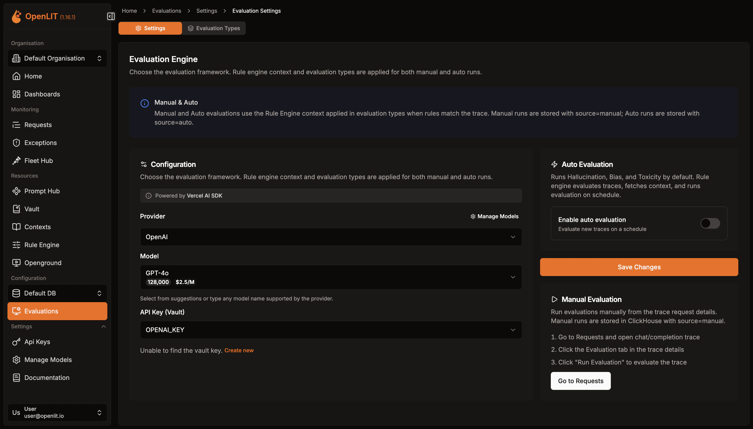 OpenLIT provides two ways to configure evaluation settings — from the Settings page or directly from a trace.Configure from Settings