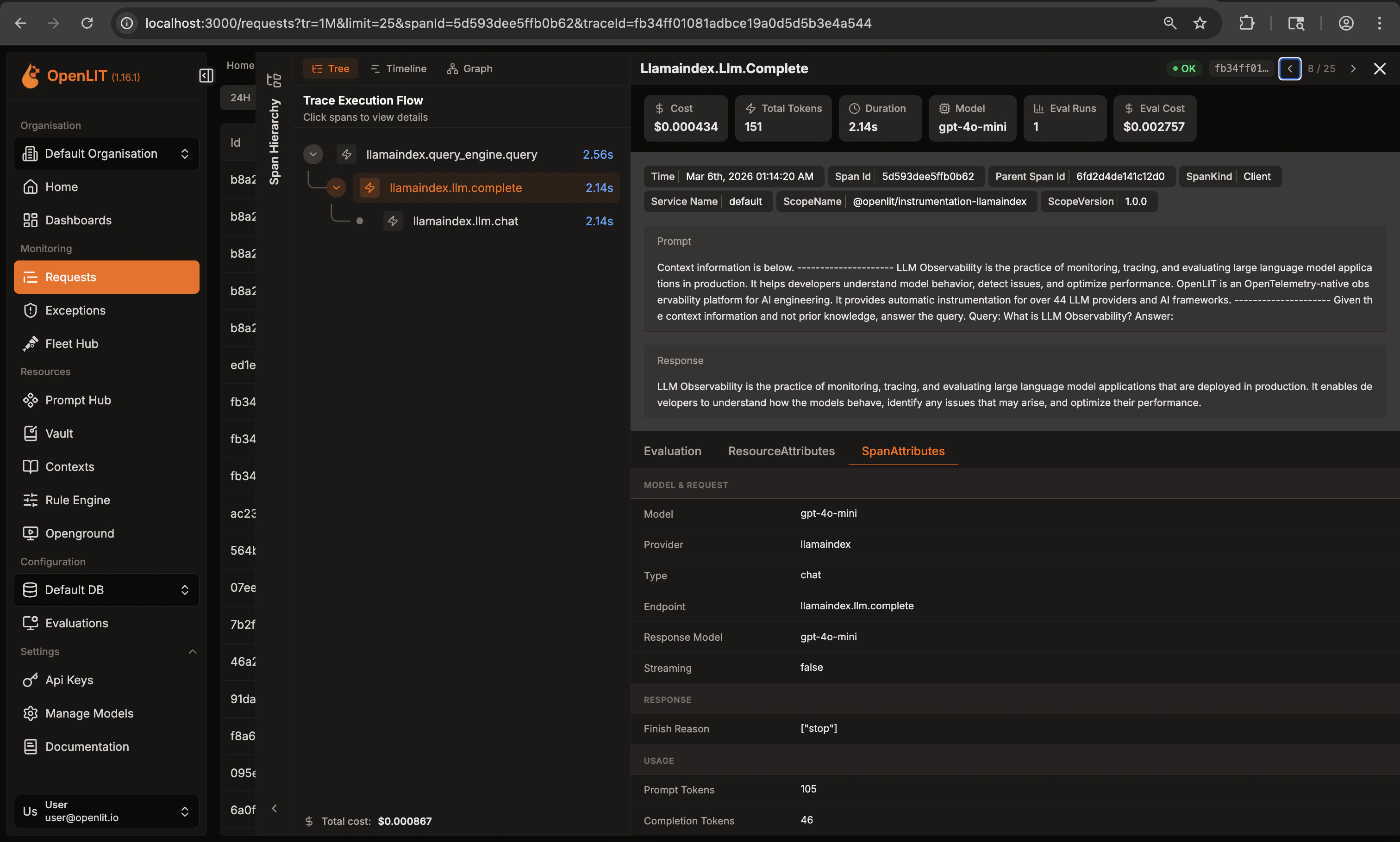 - Click on any LLM trace to view details — the trace ID and span ID are reflected in the URL for easy sharing