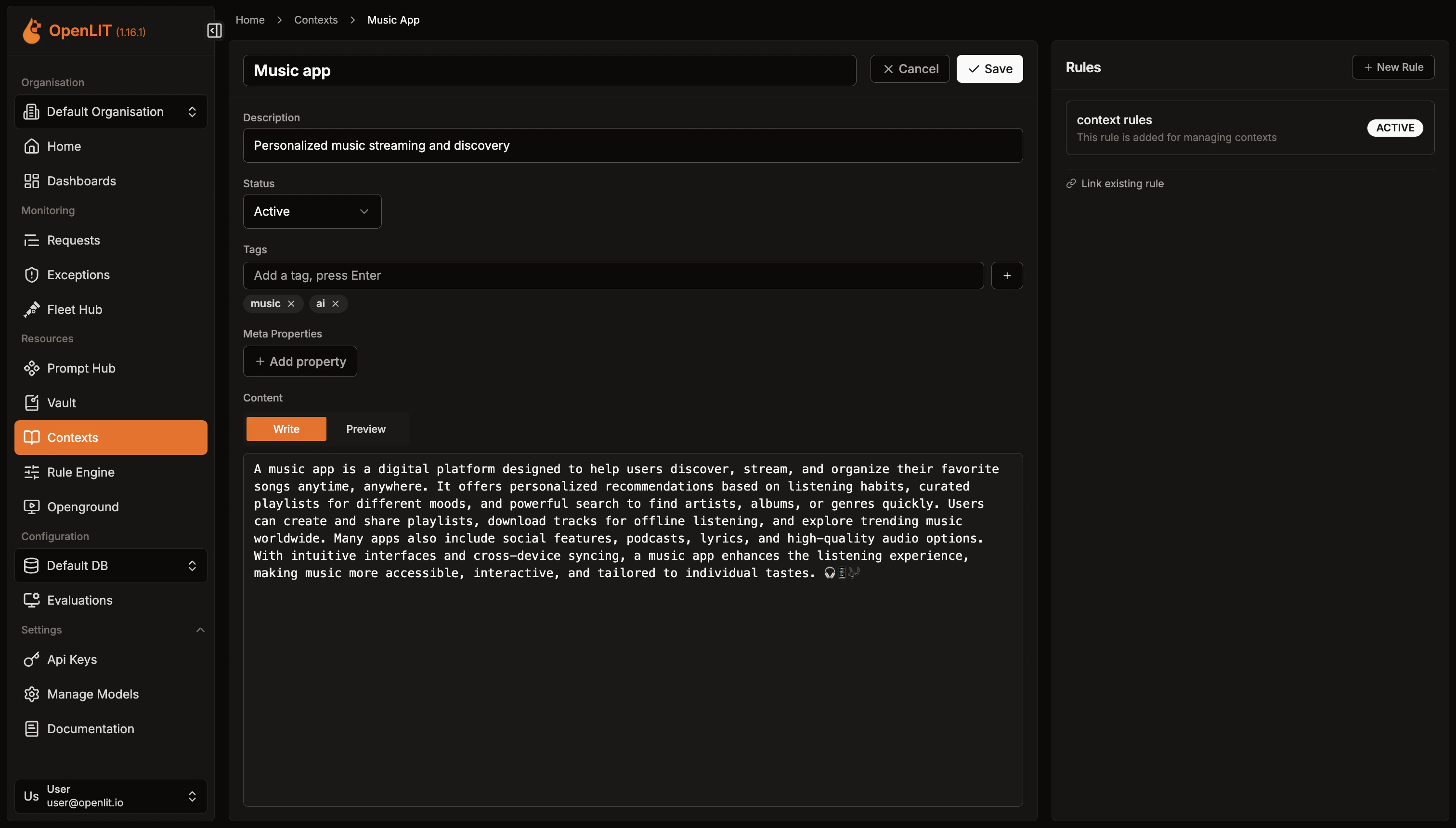 model: gpt-4,region: us). - Status control: Mark contexts as Active or Inactive to enable or disable them without deletion.